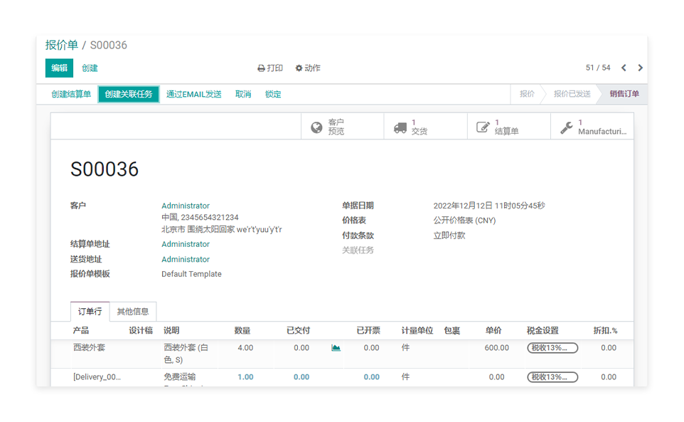 从建立报价单到确认销售订单,以及后续的研发、采购、生产、物流等环节,系统自动抓取相关数据,并且全部相关联。