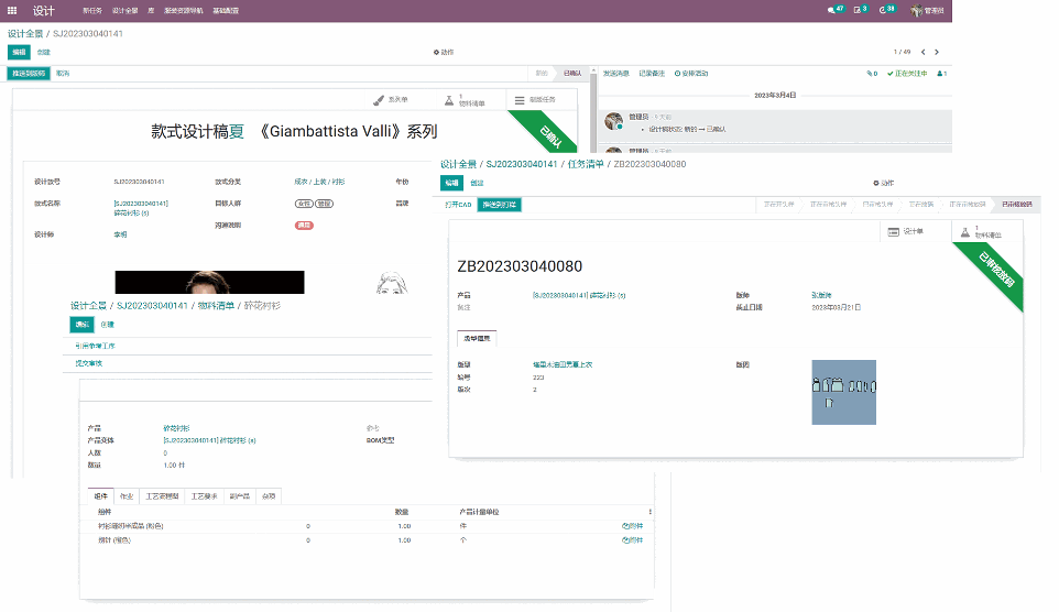 设计师通过设计全景展示其所有款式,根据款式所针对的目标人群、分类、状态、品牌、年份、季节、系列筛选查看款式当前开发进度。实时跟踪设计稿相关的版型、样衣等研发任务信息,打破信息孤岛掌握研发全流程动态。支持全网面辅料资源快速查找功能。